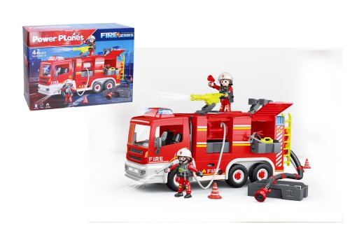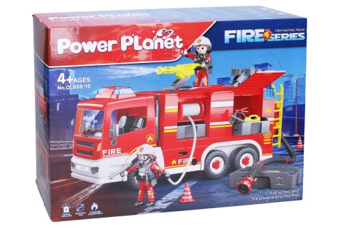 Hasičské auto stavebnice. Velikost auta 31cm. Otevírací přihrádky na autě, světelné a zvukové efekty. Baterie 2xAAA nejsou součástí.