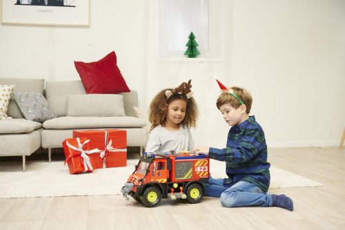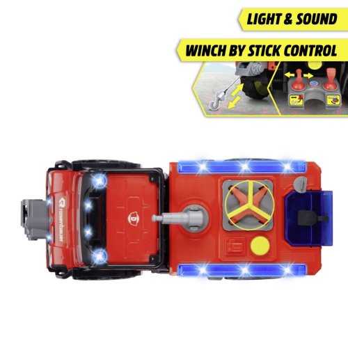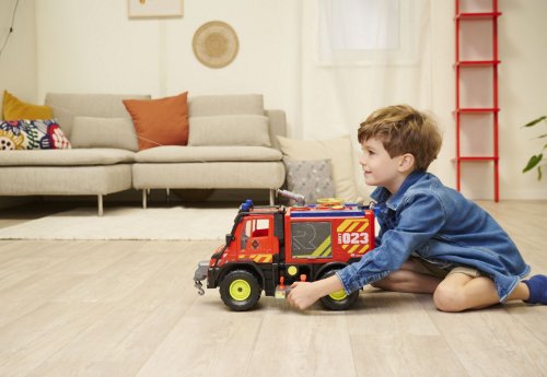 Hasičské záchranné auto Mercedes-Benz Unimog U530 na volnoběh. Má světelný a zvukový efekt, naviják ovládaný baterií, vodní pistole na stříkání vody ovládaná páčkou. Otevírací dveře, výkyvné nápravy. Součástí jsou dva drony se spouštěcí rampou ovládanou baterií. Délka auta 50 cm. Barva červená.