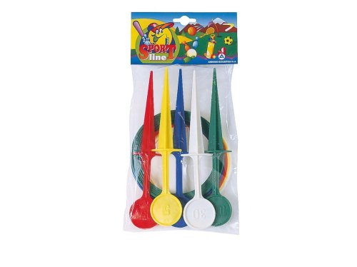 Hra Házení kroužků se zápichem na cíl – tato klasická dovednostní hra je ideální na zahradu. Cíl hry je hodit plastový kroužek tak, aby se navlékl na jeden ze svislých zapíchnutých kolíků.