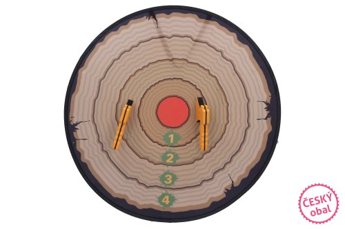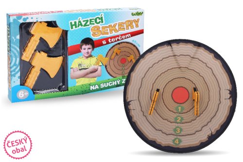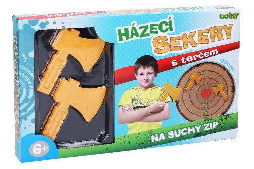 Součástí je terč s přísavkami, který jednoduše připevníte na zeď a 2 sekery se suchým zipem.