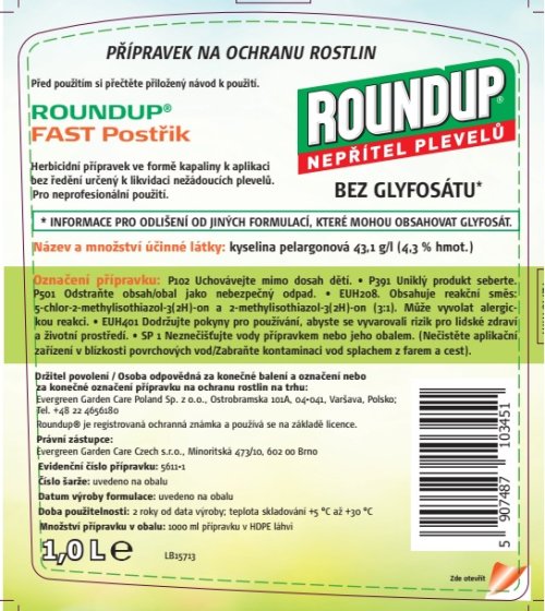Přípravek Roundup® FAST je herbicidní přípravek ve formě rozprašovače určený k likvidaci nežádoucích širokolistých a trávovitých plevelů pod okrasnými keři a stromy za předpokladu, že jsou již hlubokokořenící s dřevitou kůrou.