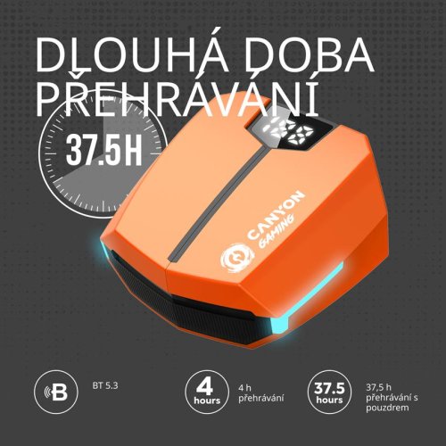Herní bezdrátová sluchátka Canyon Doublebee GTWS-2 s nízkou latencí 45 ms, Bluetooth 5.3, hudebním i herním režimem a výdrží až 37,5 hodiny s pouzdrem nabízejí pohlcující zvukový zážitek a stylovým …