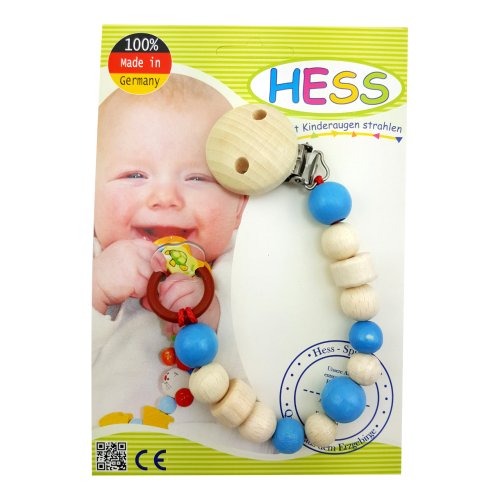 Řetízek opatřený kovovým klipsem a univerzálním pružným silikonovým kroužkem k uchycení dudlíku. Kvalitní povrchová úprava a nezávadné barvy jsou odolné vůči slinám i potu. Je vyroben v Německu, ze dřeva z německých lesů. Hlavní vlastnosti:univerzální silikonový kroužekpraktický kovový klipsodolné a ekologické zpracování