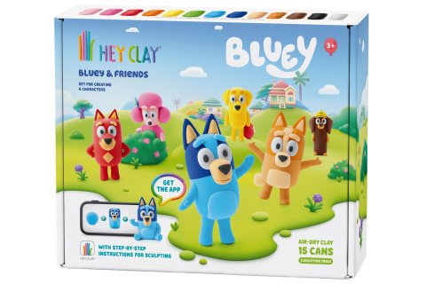 Sada HEY CLAY inspirovaná postavičkami z populární série Bluey! Velká sada 15 kelímků + 2 modelovací nástroje. Ze sady sestavit 6 postav. Věk 3+