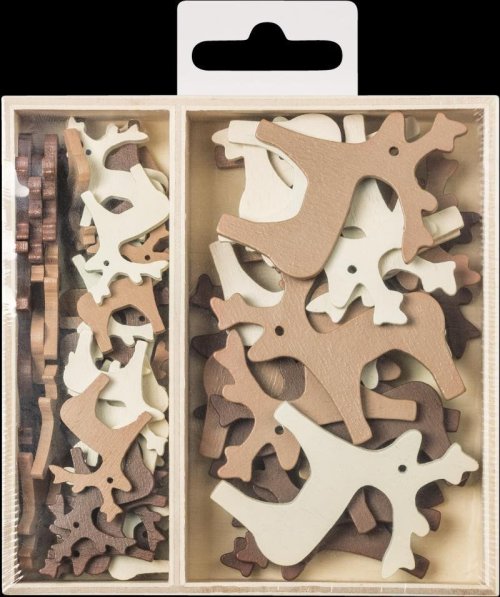 Dřevěné ozdoby v praktickém boxu, 9 motivů po 5 ks od každého motivu, celkem tedy 45 kusů dekorací.
