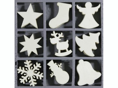 45 ks Dřevěné ozdoby v boxu - vánoce - 9 motivů po 5 ks, rozměr 10,5 x 10,5 cm