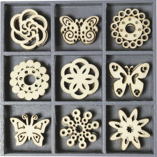 Dřevěné ozdoby v praktickém boxu, 9 motivů po 5 ks. Rozměr jednoho motivu cca 3cm x 3cm. Ideální pro zdobení přáníček, dárků, krabiček apod.