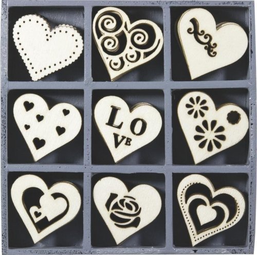 Dřevěné ozdoby v praktickém boxu, 9 motivů po 5 ks. Rozměr jednoho motivu cca 3cm x 3cm. Ideální pro zdobení přáníček, dárků, krabiček apod.