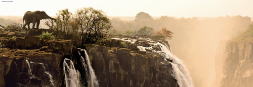 Jedinečný záběr špičkového fotografa Marsela van Oostena s krmícím se slonem na okraji Viktoriiných vodopádů na řece Zambezi v Zambii.
