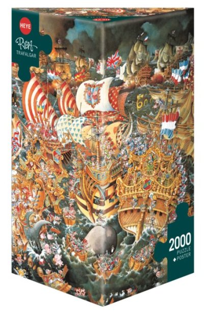 Puzzle od karikaturisty Michaela Ryby balené v netradiční trojboké krabici, která obsahuje plakát jako předlohu pro skládání.