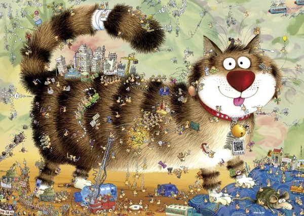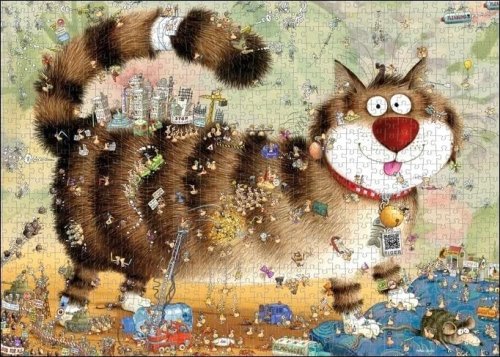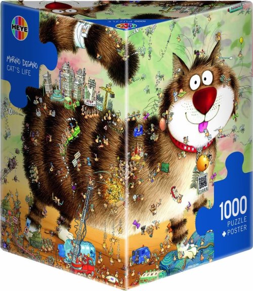 Puzzle od karikaturisty Marina Degana balené v netradiční trojboké krabici, která obsahuje plakát jako předlohu pro skládání.