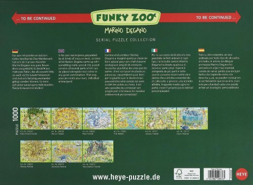 Chcete mít doma vlastní ZOO? Vytvořte si ji z puzzle ze série HEYE , kterou vtipně ztvárnil známý karikaturista Marino Degano. Jednotlivé motivy se zvířecími "pavilony" lze zavěsit vedle sebe v libovolné kombinaci a vytvořit tak ZOO podle vlastních představ. Okrajové prvky (obloha, řeka, keře, cesta) jsou totiž namalovány tak, aby na sebe obrázky ze série Šílená ZOO vždy navazovaly, ať už jsou poskládány v jakémkoliv pořadí. Rozměr složeného puzzle cca 70 x 50 cm