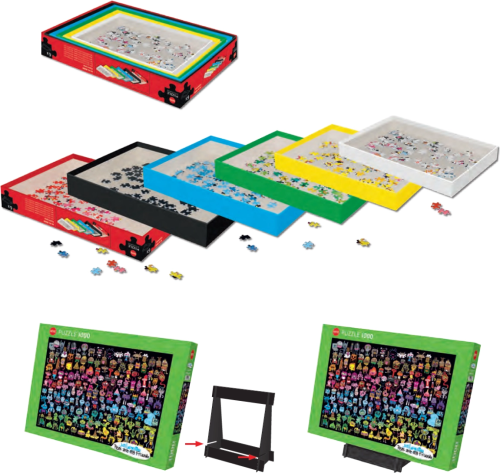 Šest praktických různobarevných krabiček je ideální pomůckou při skládání puzzle. Každá krabička má jinou barvu i velikost. Pro úsporu místa je lze vkládat do sebe (pokud nejsou úplně plné). Součástí balení je i praktický stojan na předlohu (krabici).