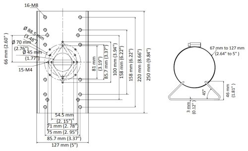 Držák pro montáž kamer na sloup/trubku, zatížitelnost 10 kg. Použitelné na trubku průměru 67 až 127 mm. Trubka musí unést více než 3krát větší hmotnost, než je celková hmotnost kamery a držáku.