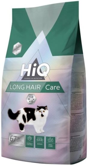 Kompletní krmivo HiQ pro dospělé dlouhosrsté kočky je správná volba pro dokonalou péči o dlouhou srst vaši kočky. Vhodné pro kočky starší než 1 rok. Komponenty krmiva pomáhají zachovat lesk a hustotu srsti a dále dbají na zdraví pokožky. Odstraňují hrudky srsti nahromaděné v žaludku. Napomáhají k posílení dásní a snížení rizika tvorby zubního kamene. Krmiva HiQ nové generace byla vytvořena podle speciální receptury, jejímž základem je vědecký pokrok a bohatství přírody. NanoAgent Krmiva HiQ obsahují přírodní minerální látku ve formě nanočástic, které se říká NanoAgent. Ve chvíli, kdy se živiny v organismu dostanou do kontaktu s látkou NanoAgent, začnou se pohybovat rychleji, což vede k lepšímu zažívání a jejich účinnějšímu vstřebávání. Čistý kokosový olej Krmiva HiQ pro dospělá zvířata jsou obohacena přírodním a blahodárným čistým kokosovým olejem. Tento olej pomáhá optimalizovat metabolismus zvířat a zlepšuje stav jejich zažívacího traktu. Čistý kokosový olej také příznivě ovlivňuje kůži a srst a chrání před infekcemi a chorobami. Tato přísada stimuluje aktivitu mozku a mimořádně tak prospívá domácím mazlíčkům ve vyšším věku. Přírodní přísady a antioxidanty Krmiva HiQ obsahují velké množství přírodních složek, jako jsou sušené brusinky, lněná semínka, sušený měsíček, zelený čaj, výtažek z juky a řada dalších. Přírodní antioxidanty – výtažky z rozmarýnu a tokoferol z rostlinného oleje, spíše známý jako vitamín E – chrání krmiva před zkažením a oxidací. Složení: Drůbeží maso 38 % (sušené a jemně mleté), rýže, kukuřice, drůbeží tuk, kukuřičný lepek, rybí moučka, cukrovkové řízky, celulóza, lněné semínko, pivovarské kvasnice, kokosový olej (1%), dynamicky mikronizovaný klinoptilolit (1%), sušená vejce, extrakt z čekanky, extrakt juky, chlorid draselný, manano-oligo-sacharidy (MOS), pupalkový olej, moučka z měsíčku. Analytické složky: Hrubý protein 30 %, hrubý tuk 20 %, hrubá vláknina 4,1 %, hrubý popel 6,2 %, vápník 1 %, fosfor 0,8 %, draslík 0,7 %, sodík 0,5 %, omega-3 mastné kyseliny 0,43 %, omega-6 mastné kyseliny 3 %. Doplňkové látky/1 kg: nutriční d.l.: vitamín A (3a672a) 25000 m.j., vitamín D3 (3a671) 1876 m.j., vitamín E (3a700) 688 mg, kyselina listová (3a316) 2,5 mg, biotin (3a880) 1,9 mg, niacin (3a314) 94 mg, vitamín B6 (3a831) 5 mg, vitamín B1 (3a821) 6,25 mg, cholinchlorid (3a890) 1562 mg, síran železnatý (3b103) 62,5 mg, jodičnan vápenatý (3b202) 1,88 mg, síran měďnatý (3b405) 6,25 mg, síran manganatý (3b503) 25 mg, síran zinečnatý (3b605) 144 mg, seleničitan sodný (3b801) 0,13 mg, taurin (3a370) 1250 mg, L-karnitin (3a910) 100 mg. Technologické d.l.: extrakt rozmarýnu, tokoferolové extrakty z rostlinných olejů (1b306(i)). Dávkování: