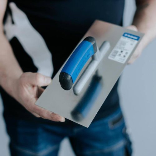Ocel nerezová, kyselině odolná, toušťka: 0.7 mm, dvousložková rukojeť (G-1), na podlahy, nanášení omítek, lepidel a štuků, zaoblené rohy, broušená, leštěná, na štukatérské práce. EAN 5907798304585