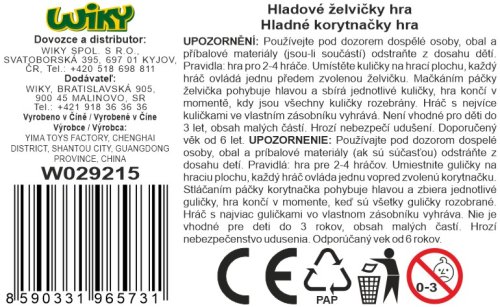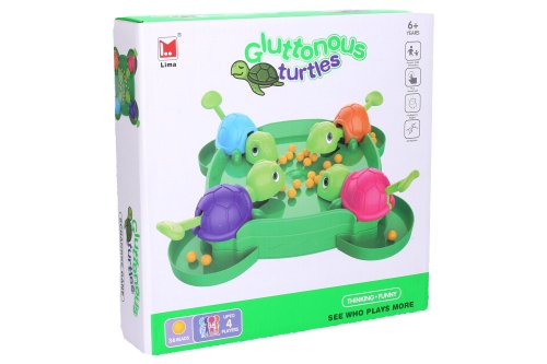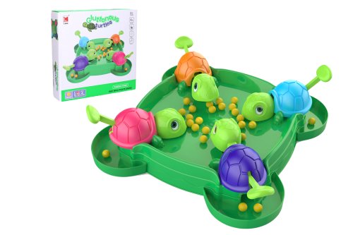 Až 4 hráči. Rozměr hrací plochy 23x23x5 cm. Obsah balení - hrací plocha, 36 kuliček, 8 samolepek očí pro želvičky. Vysypte všechny korálky na hrací plochu a snažte se jich co nejvíce sníst. Želvička, která sní nejvíce korálků, vyhrává. Páčka v zadní části krunýře slouží k ovládání hlavy želvičky.