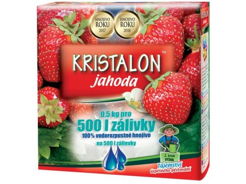 Kristalon jahoda 0,5 kg zajistí rychlejší počáteční růst díky přímé absorpci fosforu, rychlejší nástup produkčního období. Je vhodné pro všechny druhy jahod pěstovaných ve volné půdě i v nádobách. Dávkování: 1 odměrka (10g) hnojiva se rozpustí v 10 l vody a vystačí pro přibližně 5 m2 plochy. Balení 0,5kg je určeno pro 500 l zálivky celkem.