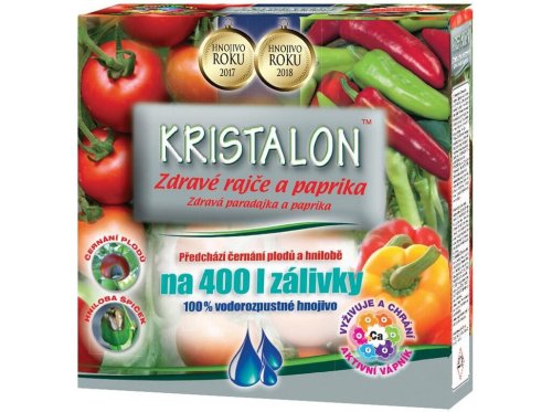 Kristalon Zdravé rajče a paprika je dvousložkové hnojivo, které účinně dodává potřebné živiny a zabraňuje jejich vzájemnému zablokování. Je zdrojem všech základních živin potřebných ke zdravému vývinu plodů rajčat i paprik. Je účinnou prevencí proti černání plodů rajčat a hnilobě konců paprik. Vápník je účinnou prevencí proti hnilobě konců paprik a plodů rajčat Bohatý zdroj rychle přijatelného vápníku (26,5 % CaO). Speciální Kristalon s obsahem 2 složek - hnojivo 300 g + vápník 200 g
