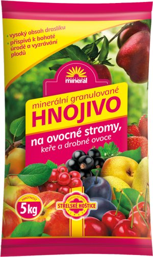 Granulované hnojivo na ovocné stromy a další drobné ovoce je vhodné ke hnojení na začátku vegetace a k dalšímu přihnojování v průběhu vegetačního cyklu. Vzhledem k vyváženému obsahu základních živin a poměrně vysokému obsahu draslíku přispívá k bohaté úrodě a vyzrávání plodů, zlepšuje jejich skladovatelnost a zvyšuje odolnost proti hnilobám. Hnojivo se rovnoměrně rozhodí kolem rostliny a vhodným nástrojem se lehce zapraví do půdy v dávce: ovocné stromy 100 - 120 g / m2, drobné ovoce 60 - 80 g / m2. Složení: 11% N, 9% P2O5, 12% K2O, 2% MgO.