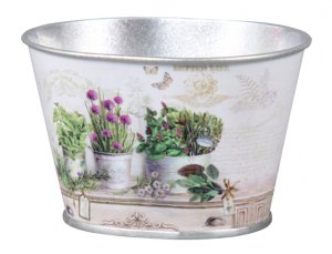 Malý plechový obal s potiskem bylinek v květináčích. Šířka: 8 cm, výška: 6 cm, hloubka: 10 cm.
