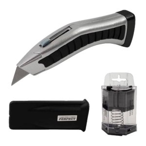 tvarované hliníkové tělo s protiskluzovým povlakem plastové pouzdro k připevnění na opasek 50 ks lichoběžníkových čepelí v ergonomickém zásobníku přihrádka na použité nože ve spodní části zásobníku
