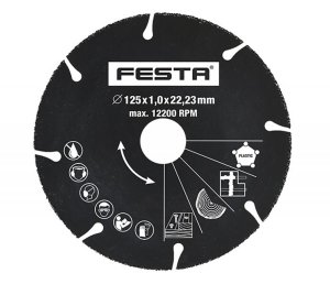 Kotouč řezný univerzální 125 x 1,0 x 22,2 mm, karbidový FESTA. rozměry: 125 x 1,0 x 22,2 mm Univerzální řezný koutouč s karbidovou vrstvou Vhodný pro dřevo, dřevo s hřeby, zdivo, plasty, ocelové plechy, …