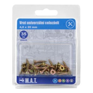 rozměry (pr. x D)): 4,0 x 20 mm materiál: Zn celozávit 35 ks Univerzální vrut je spojovací součástka s vnějším závitem, určená k vytváření rozebíratelných spojů především měkkých materiálů (dřevo, plast, …