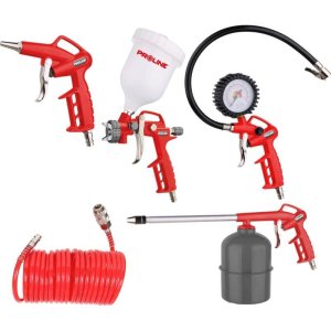 kompresorová sada sada obsahuje: lakovací pistoli s horní nádrží, nafukovací pistole, mycí pistole, ofukovací pistole, PU spirálová pneumatická hadice pracovní tlak 5 barů - max. 8 barů