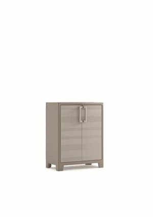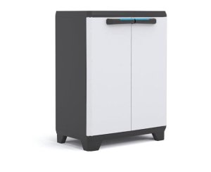 Nízká plastová skříň, 1 nastavitelná police, nosnost 15 kg, nastavitelné nožky, 68 × 90 × 39 cm.