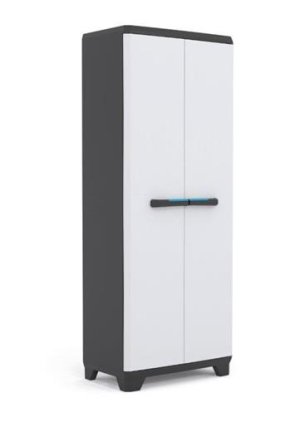 Plastová skříň, 3 nastavitelné police, nosnost každé police 15 kg, uzamykatelná, rozměry 68 × 173 × 39 cm.