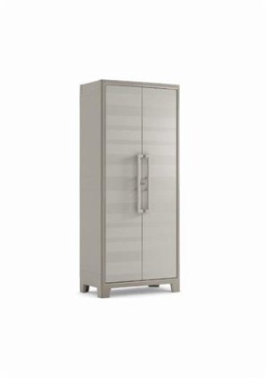 Vysoká plastová skříň s UV ochranou, IPX3 voděodolnost, 4 police s nosností 30 kg, možnost zamykání, rozměry 80 x 44 x 182 cm.