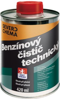 Technický benzín, 420 ml. Přípravek je určen k čištění kovových předmětů a textilií, lze použít do zapalovačů.