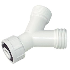 rozdvojka pro přívodní hadice plastová rozdvojka pro přívodní pračkové hadice k montáži na ventil koncovky pro připojení: 2 x 3/4" vnější závit, 1 x 3/4" matice