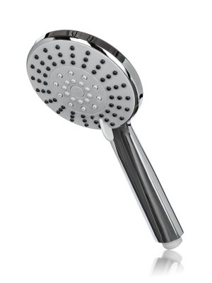 Malá pochromovaná sprchová hlavice s jednou funkcí rozstřiku.