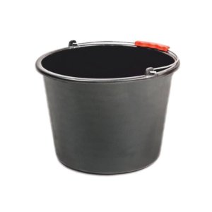 Černé stavební vědro tzv. zednická nádoba s výlevkou.