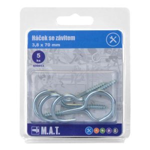 rozměry (D x pr.): 70 x 3,8 mm materiál: Zn 5 ks Háček se závitem 70 x 3,8 mm pro uchycení předmětů a břemen do různých materiálů.