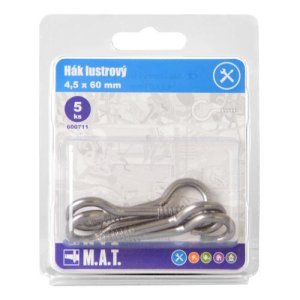 Hák lustrový 80 x 5,2 mm, lesk (4 ks). rozměry (D x pr.): 80 x 5,2 mm lesk balení: 4 ks Hák lustrový 80 x 5,2 mm slouží k upevnění lustru do různých materiálů.