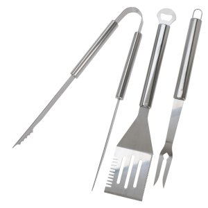 sada nářadí na grilování 3ks z nerezové oceli 18/0; 1 vidlice délka 455mm, tloušťka 1,8mm; 1 pár kleští délka 445mm, tloušťka 1,8mm (bez koženého řemínku); 1 obracečka s drážkou 475x90mm, tloušťka 1,5mm, …
