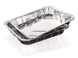 Obdélníkové hliníkové grilovací tácky s průduchy pro jednorázové použití.