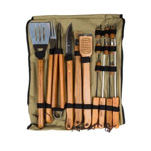 18dílná sada grilovacího náčiní s dřevěnou rukojetí balená v praktickém textilním obalu obsahuje: čístící drátěný kartáč, grilovací zubaté kleště, obracečku, porcovací nůž, vidličku se 3 hroty, 4 grilovací …
