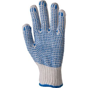 Ochranné pracovní rukavice bavlněné s pružným nápletem na zápěstí, máčené v modrém nitrilu.