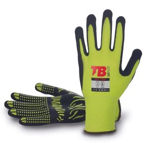 Reflexní žluté rukavice z bavlny a elastanu máčené v pěnovém nitrilu se speciálním PVC povrstvením na dlani a prstech pro zlepšení úchopu Pletená manžeta Hustota úpletu 13 GG