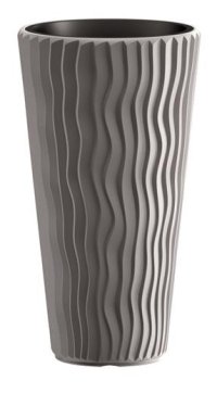 Vysoký květináč, objem 37 l, design s texturou vlnek, vhodný do exteriéru i interiéru, v balení praktická vložka pro sázení rostlin, rozměry 34,9 x 62 x 34,9 cm, šedá barva.