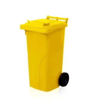 Barva žlutá, plastová popelnice na odpad s kolečky.