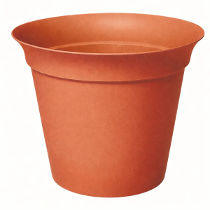 Tenkostěnný pevný plastový květník klasického tvaru.
