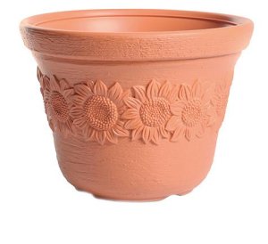 Plastový květináč v barvě terakota.