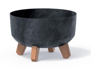 Plastová, samozavlažovací žardinka na krátkých nožkách v imitaci dřeva.
