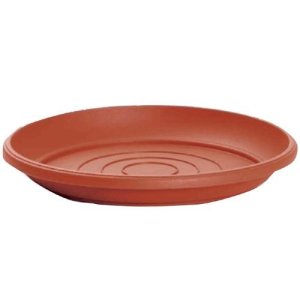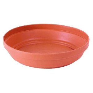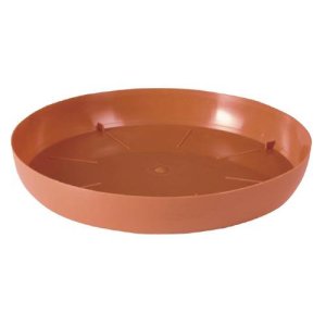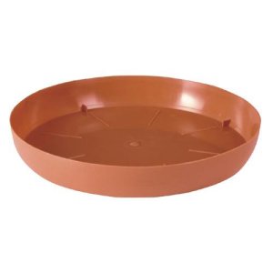 Plastová terakotově zbarvená v půdorysu kruhová miska pod květník TERRA.