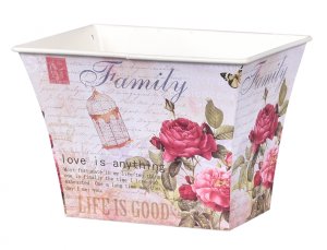 Plechový hranatý truhlík s potiskem růží, nápisů a razítek. Šířka: 20 cm, výška: 15 cm, hloubka: 14 cm.